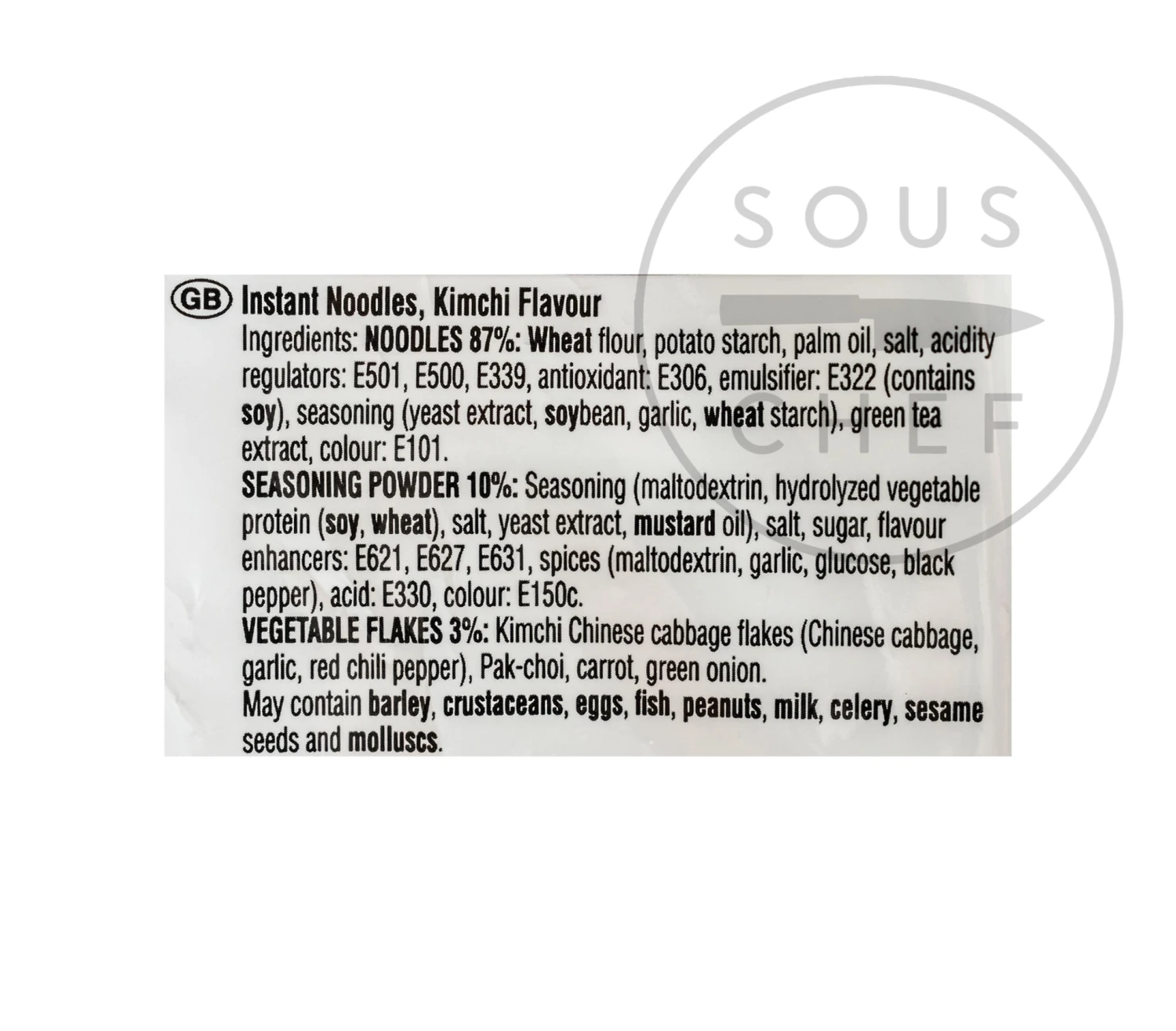 Ingredients: Noodles 87%: Wheat flour, potato starch, palm oil, salt, acidity regulator: E501, E500, E339, antioxidant E306, emulsifier: E322 (contains soy), seasoning (yeast extract, soybean, garlic, wheat starch), green tea extract, colour E101. Seasoning powder 10%: Seasoning (maltodextrin, hydrolyzed vegetable protein (soy, wheat), salt, yeast extract, mustard oil), salt, sugar, flavour enhancers: E621, E627, E631, spices (maltodextrin, garlic, glucose, black pepper), acid: E330, colour: E150c. Vegetable flakes 3%: kimchi Chinese cabbage flakes (Chinese cabbage, garlic, red chilli pepper), Pak-choi, carrot, green onion.