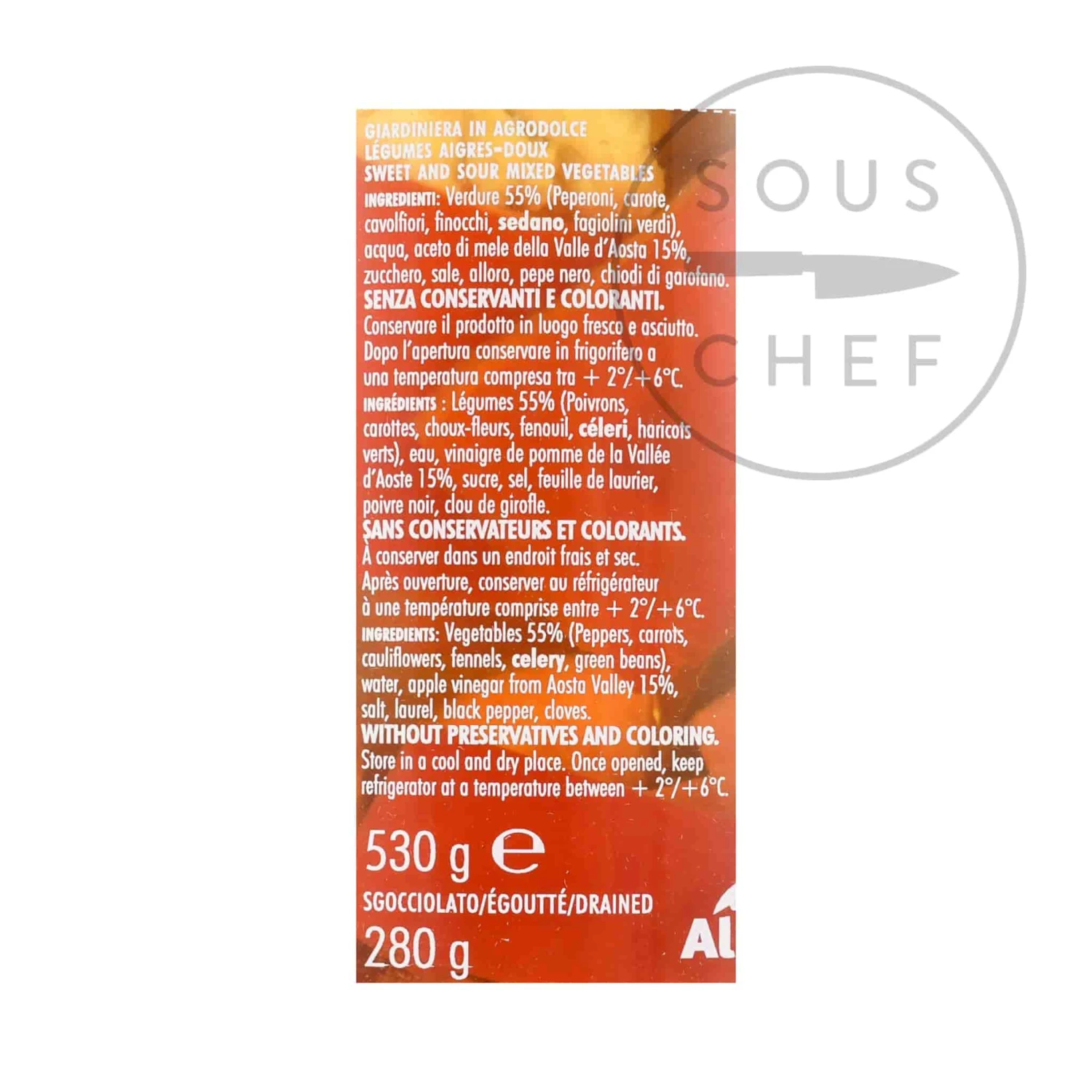 Ingredients: Vegetables 55% (Peppers, carrots, cauliflowers, fennels, celery, green beans), water, Aosta Valley apple vinegar, sugar, salt, laurer, black pepper, cloves.
