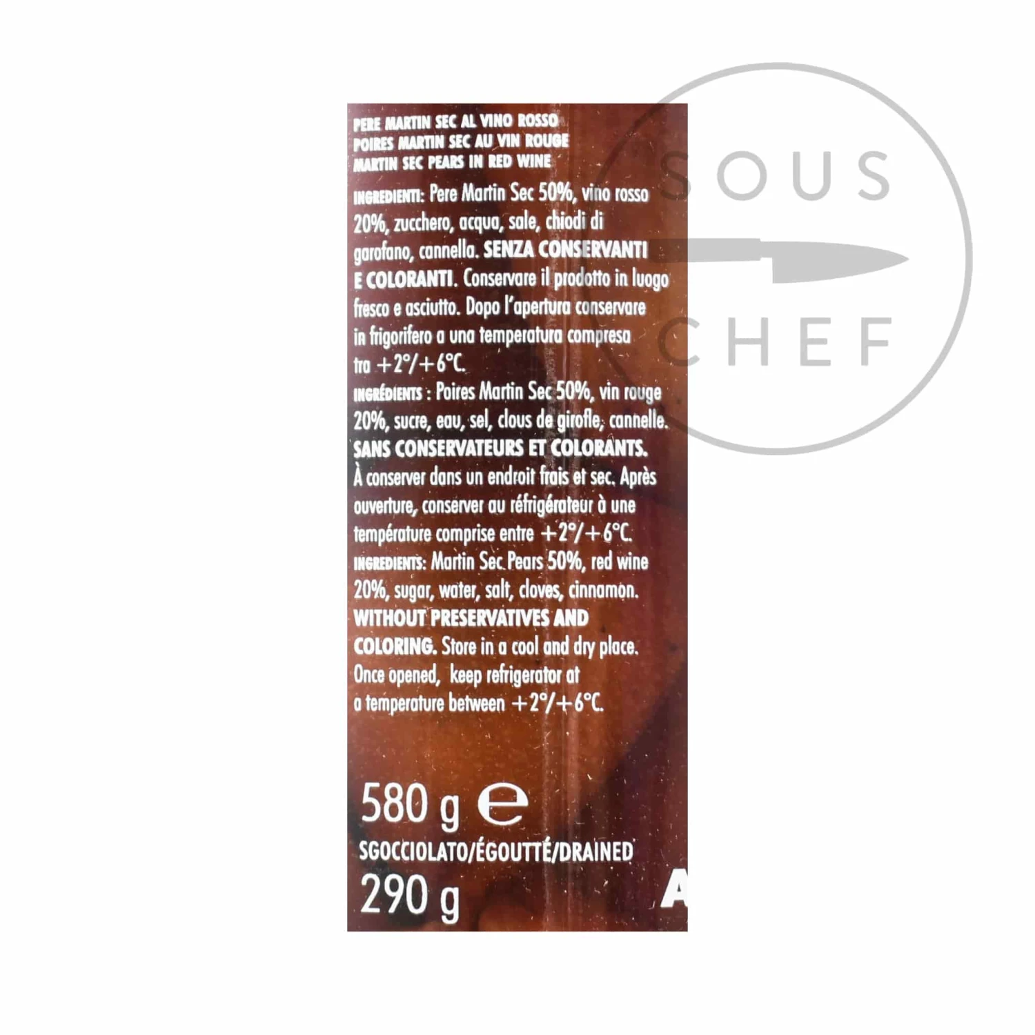Ingredients: Pears Martin Sec 50%, red wine 20%, sugar, water, salt, spices