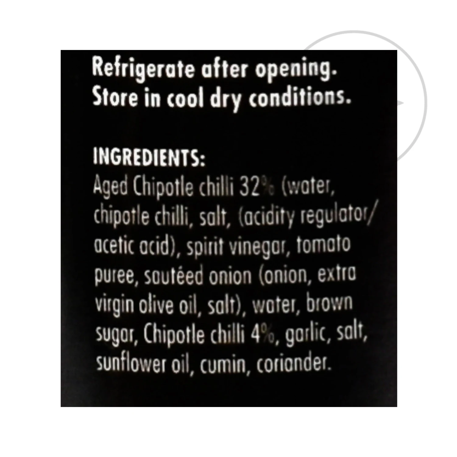 Ingredients: aged chipotle chilli (32%) (water, chipotle chilli, salt, acidity regulator: acetic acid), spirit vinegar, tomato puree, sautéed onion (onion, extra virgin olive oil, salt), water, brown sugar, chipotle chilli (4%), garlic, salt, sunflower oil, cumin, coriander.