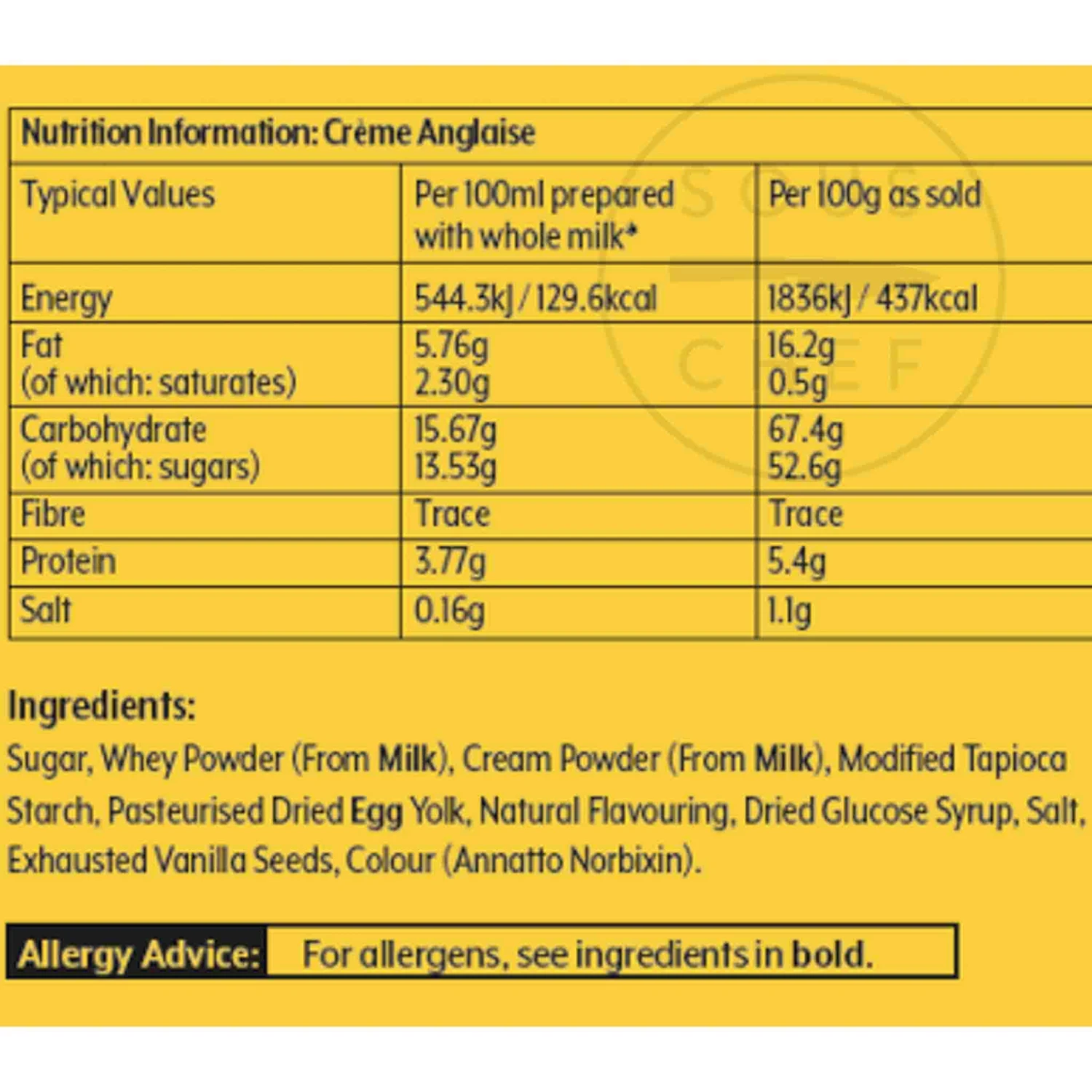 Ingredients: Sugar, whey powder (from milk), cream powder (from milk), modified tapioca starch, pasteurised dried egg yolk, natural flavouring, dried glucose syrup, salt, exhausted vanilla seeds, colour (annatto norbixin).