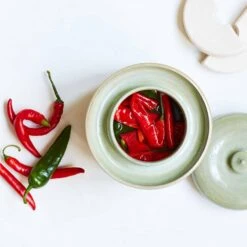 This handmade stoneware fermenting crock in green is a beautiful piece of kitchen equipment for those that love making sauerkraut, kimchi and pickles at home.
