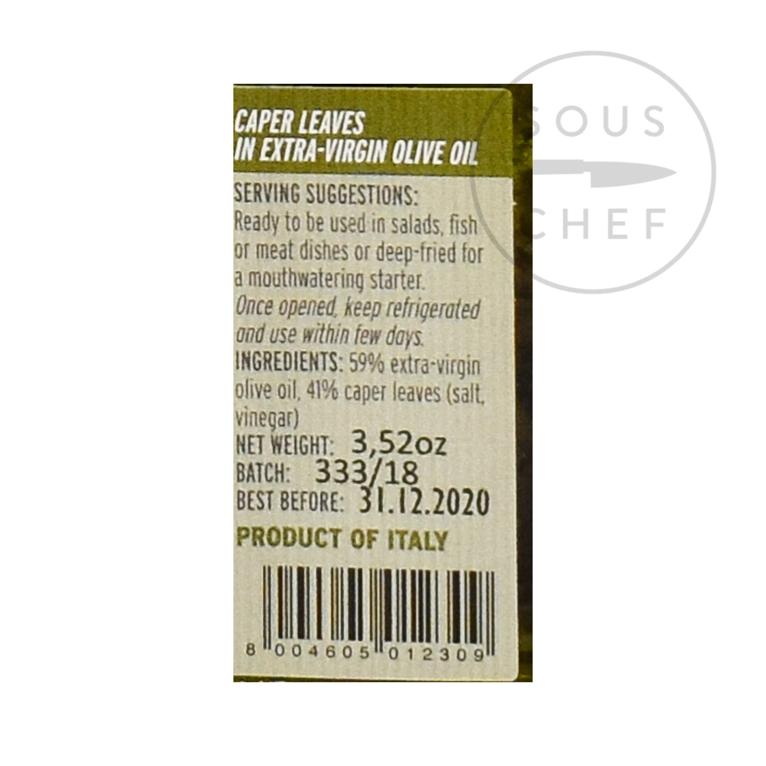 Ingredients: extra virgin olive oil (59%), caper leaves (salt, vinegar) (41%).