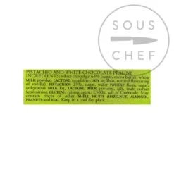 Ingredients: white chocolate 63% (sugar, cocoa butter, whole milk powder, lactose, emulsifier: soy lecithin, natural flavouring of vanilla), pistachios 23%, sugar, wafer (wheat flour, sugar, anhydrous milk fat, lactose, milk proteins, salt, malt extract (containing gluten), raising agent: E500ii), salt of Guérande.