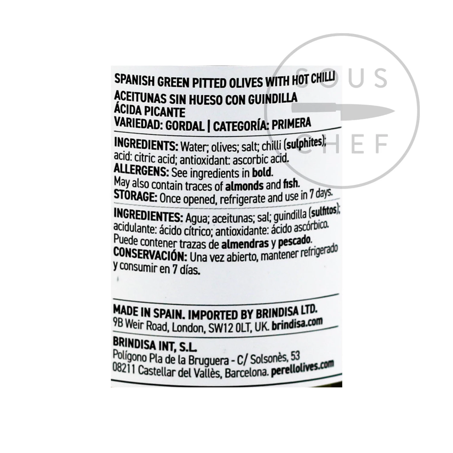 Perello Gordal pitted olives are a cult favourite among olive cognoscenti. Gordal olives are one of the finest Spanish olives – bright green, plump and crisp. These Gordal olives are tinned in brine with guindilla chilli – giving the olives a slight hot kick. Drain and serve the Gordal olives for a pre-dinner bite, or enjoy as part of an antipasti selection with cold meats and cheese. The mildly spicy olives are also a great addition to salads.