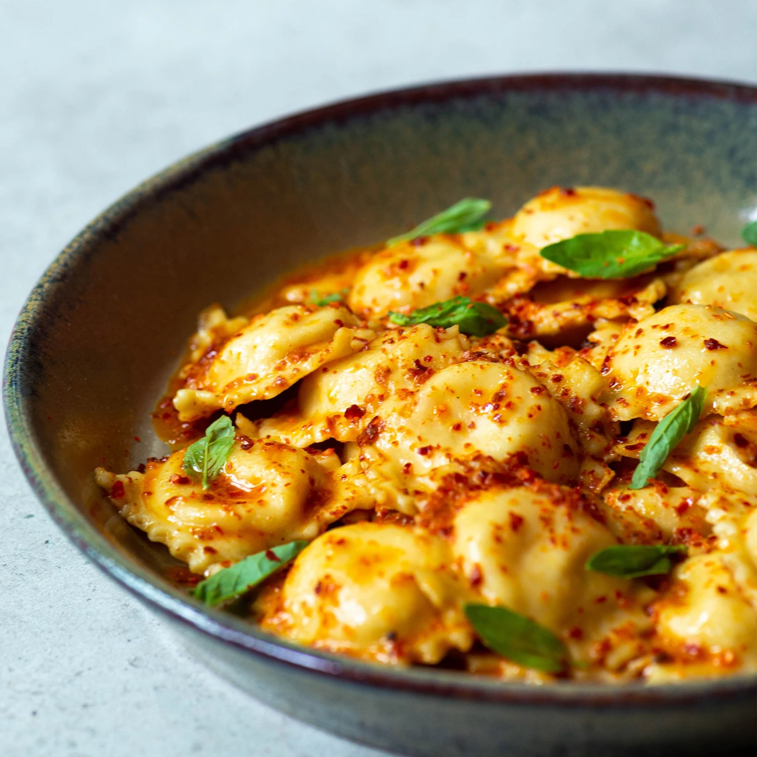 Lay down one sheet of pasta and gently press into the round indents. Fill the pasta with mushroom or goat’s cheese, lobster, pumpkin, or any other homemade filling – and then place another pasta sheet on top. Use the rolling pin to press together the parcels and and separate into individual ravioli.