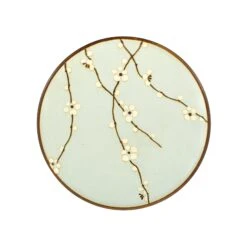 Attractive duck-egg blue stoneware plate decorated with a traditional Japanese sakura blossom pattern. The sakura blossom side plate is ideal for serving pickles and small salads as part of a spread of sharing dishes. Or use it for desserts such as yuzu panna cotta or sweet dumplings.