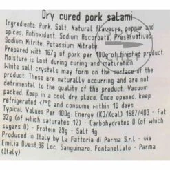 Salami Felino IGP Riserva is made by La Fattoria di Parma, a family-owned company in rural northern Italy. This dry-cured pork salami is prepared with 167g of pork per 100g of finished product, and is simply flavoured with salt, pepper and spices.