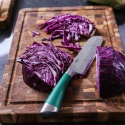 This heavy-duty cutting board features a handle and a juice canal to catch those meaty juices. The hardwood end grain is much more durable than other boards and will keep knives sharp and with minimal care, your board will last for years.
